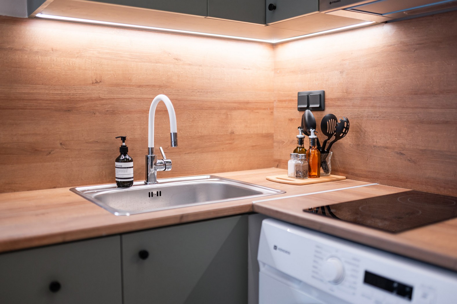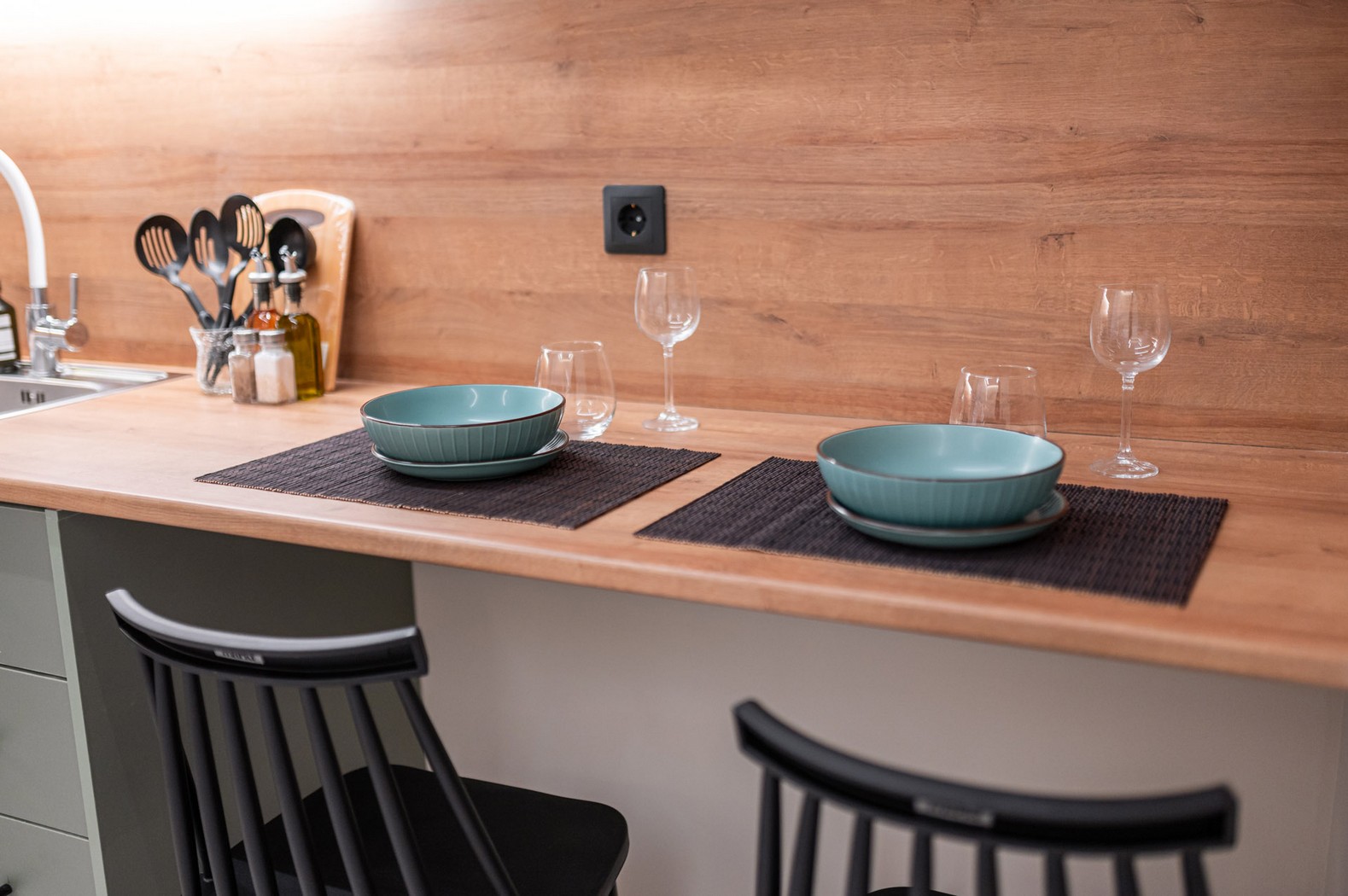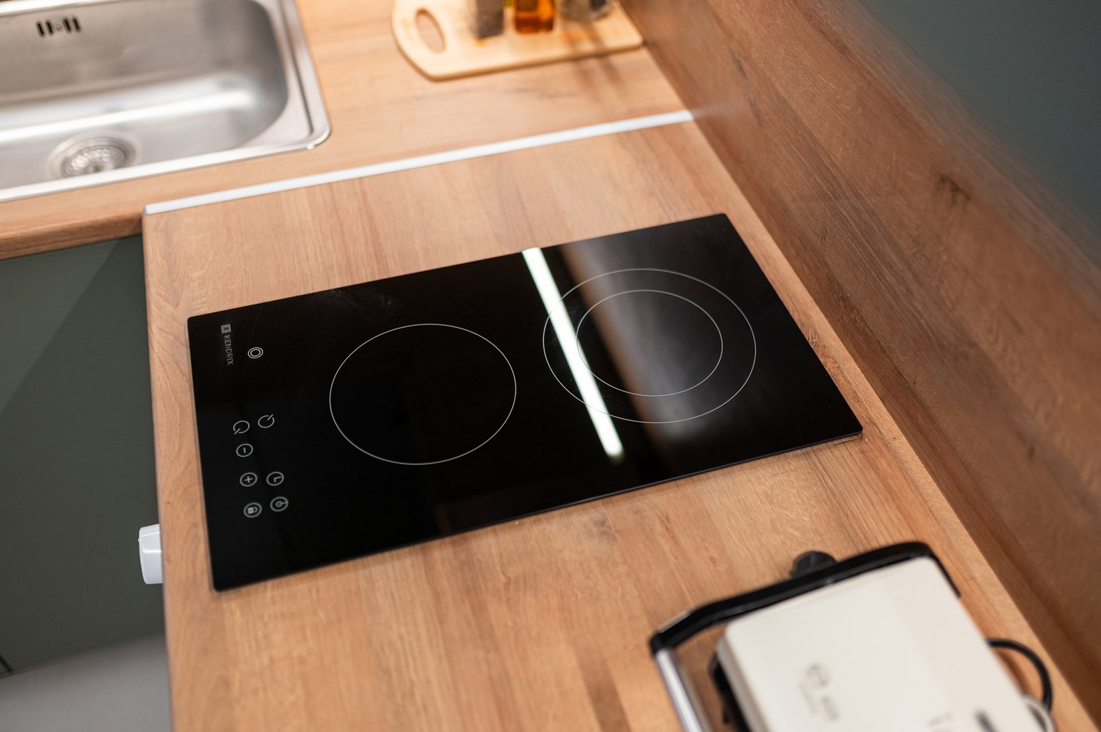 1 large double bed, 1 sofa-bed, Linen, Wardrobe/Closet, Private Entrance, Balcony, Air Conditioning, Heating, Small kitchen, Refrigerator, Stovetop, Kitchenware, Coffee machine, Tea/Coffee maker, Dining table, Bathroom with shower, Towels, Hairdryer, Washing machine, Clothes rack, Free toiletries, TV, Iron and ironing board, Non smoking, Ground floor
